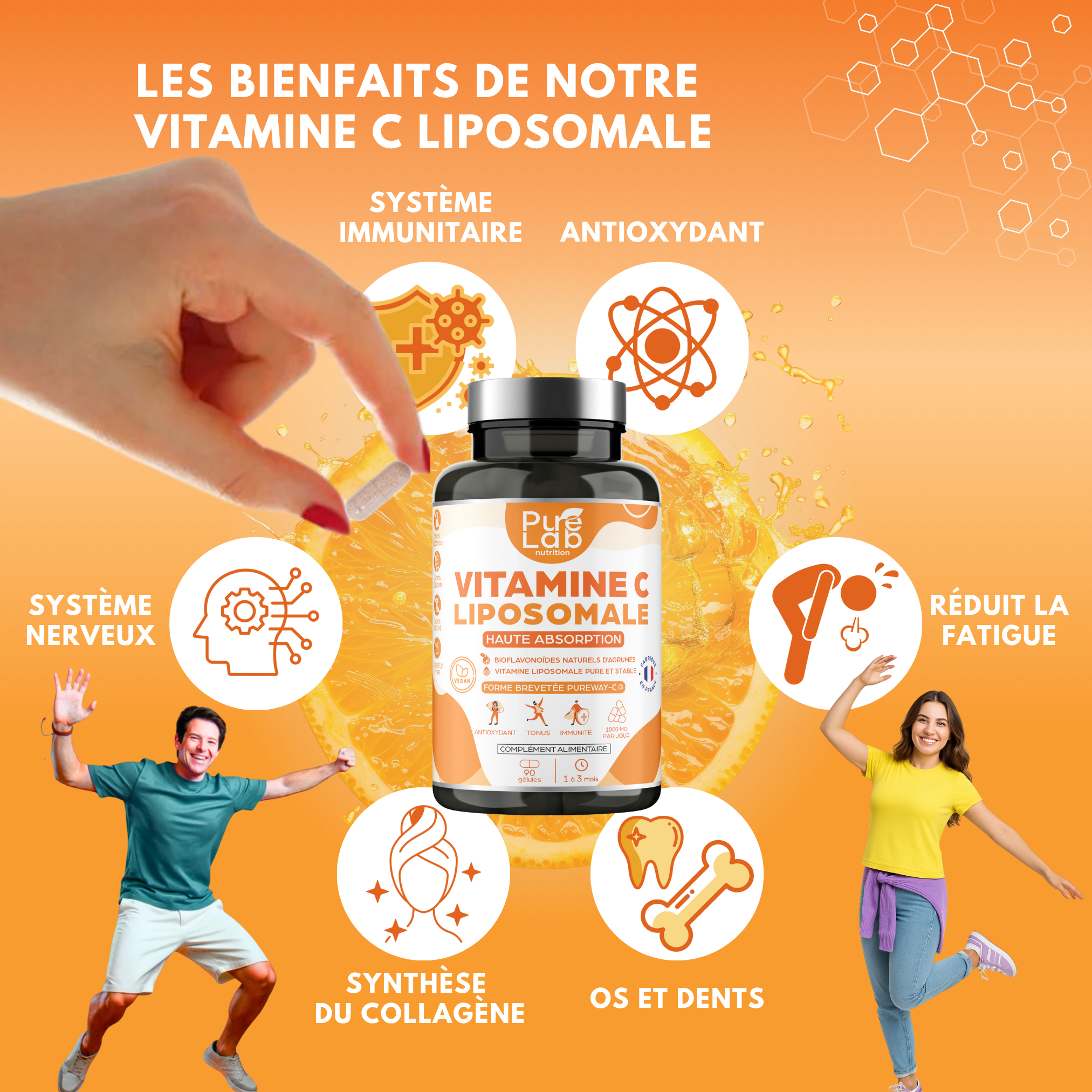 We have chosen for you a form of liposomal vitamin C (PureWay-C®) 100% pure and European certified. It is the best form of vitamin C on the market. Our treatment provides you with an intake of 1000mg/day (via 3 capsules per day), ideal for the whole family!